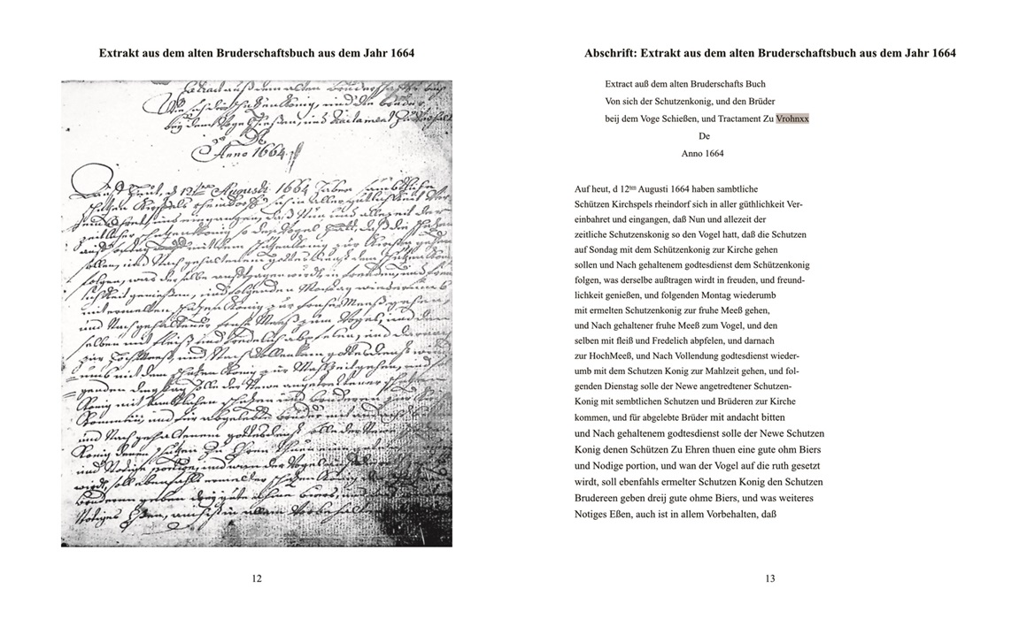 Die im »Lagerbuch von 1751« enthaltenen Protokolle (287 Seiten) über Schützen- und Patronatsfeste sowie Versammlungen sind in der damals üblichen Kurrentschrift verfasst worden. Damit die Inhalte als Zeitzeugnis für unsere und folgende Generationen verständlich bleiben, sind alle Protokolle in das lateinische Alphabet in Form der Abschrift übertragen worden. Hieraus ist das jetzt vorliegende Werk in zwei Bänden entstanden, ergänzt um einen umfangreichen Anhang (Abbildungen, Namenverzeichnis, Übersichten, Wörterbuch, Zeittafel).