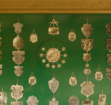 Vitrine mit ausgewählten Plaketten von Schützenkönigen aus Hitdorf 18. bis 20. Jahrhundert.